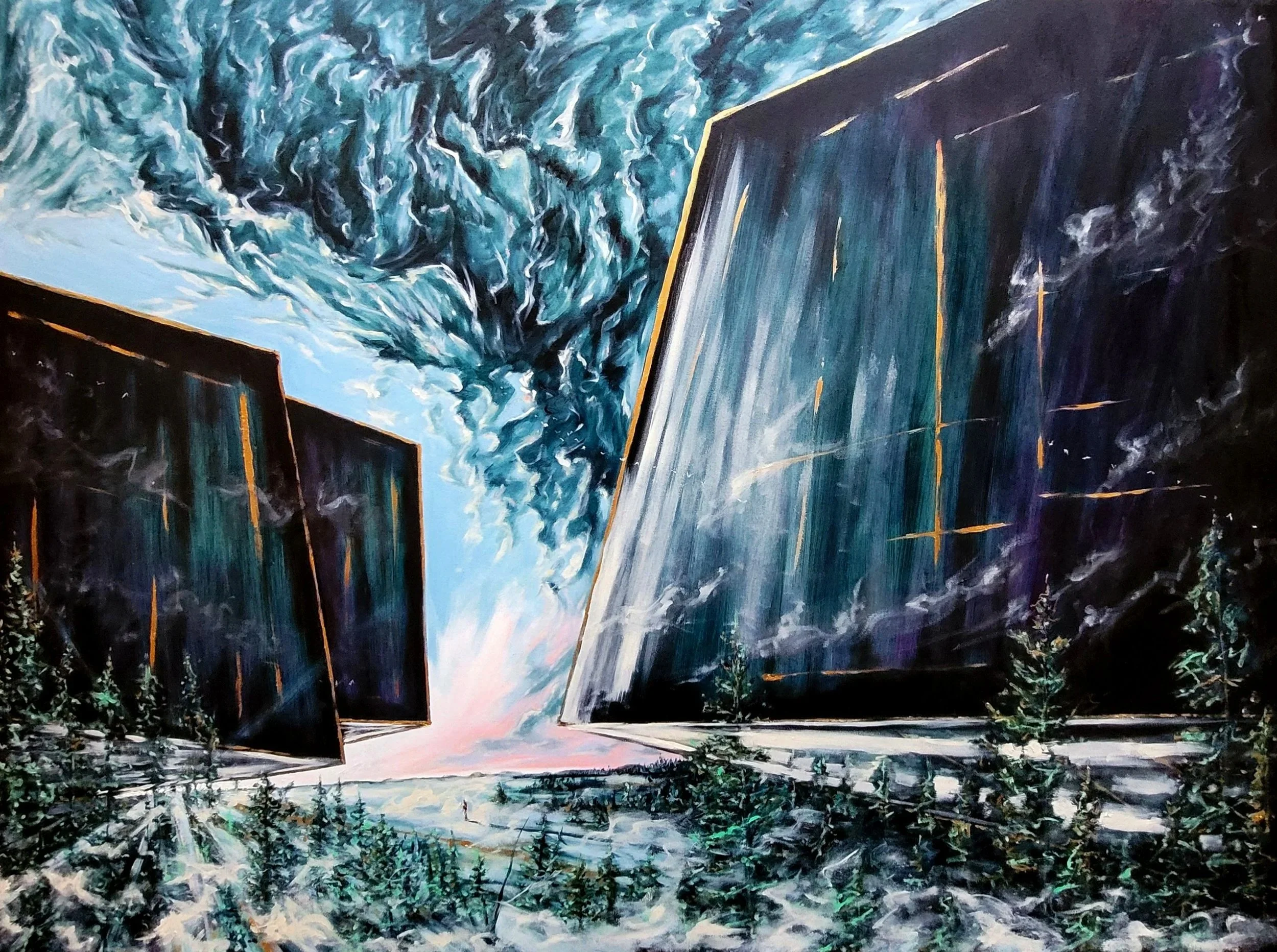 Convergence des éléments est une collection ambitieuse et expérimentale. Dans des terres inconnues où le soleil laisse place à un trou noir et où les seules constructions sont d’immenses mégalithes, j’expérimente l’impact de la géométrie sur la composition. J’explore toujours les mêmes thèmes d’ombre et de lumière où trône un sentiment d’immensité. Par contre, cette fois-ci, les paysages évoquent davantage la science-fiction. Par le fait même, le lien avec notre monde actuel est plus proche et mon petit personnage reste introspectif face à ce monde changeant. Ce monde évoque à la fois quelque chose de futuriste, d’ancien et d’oublié.